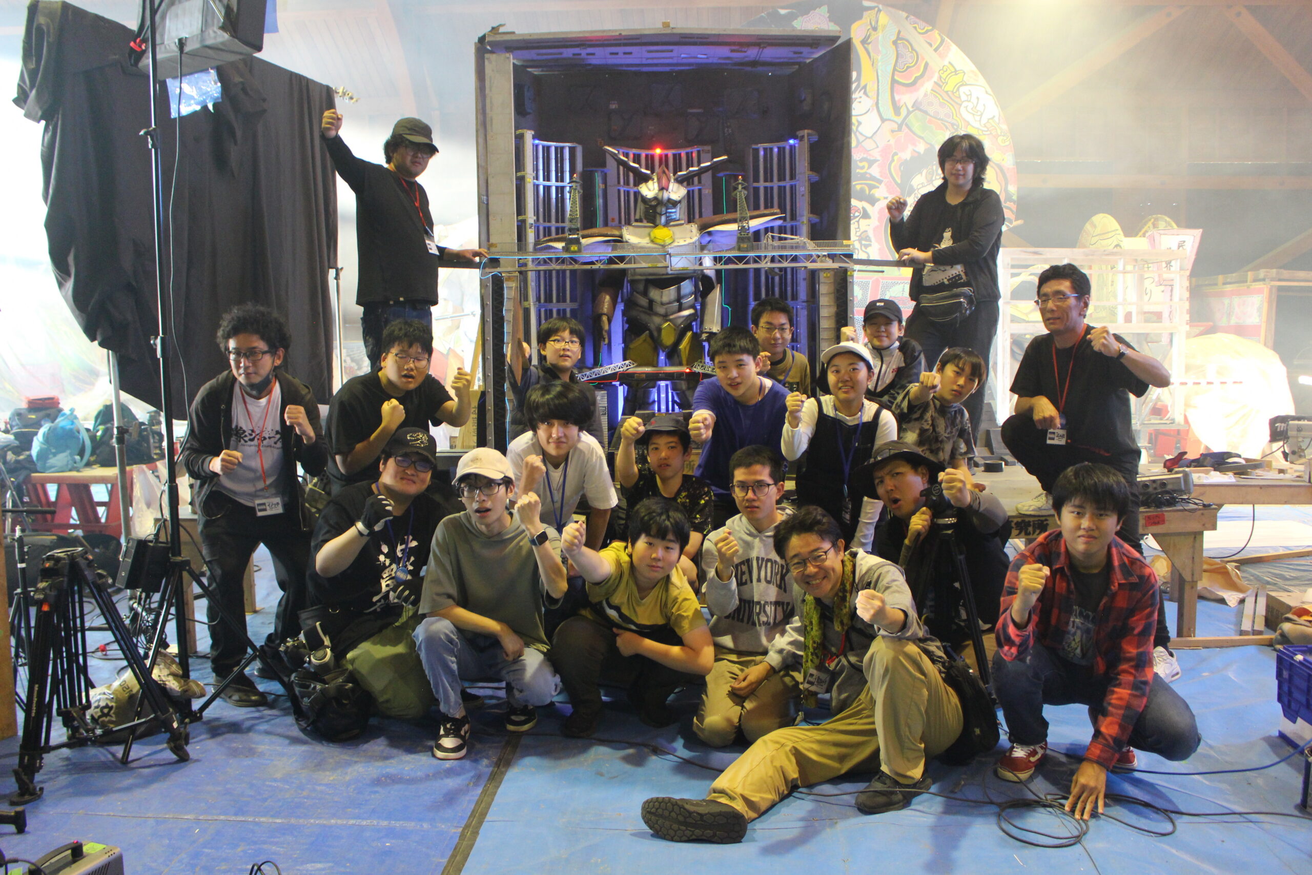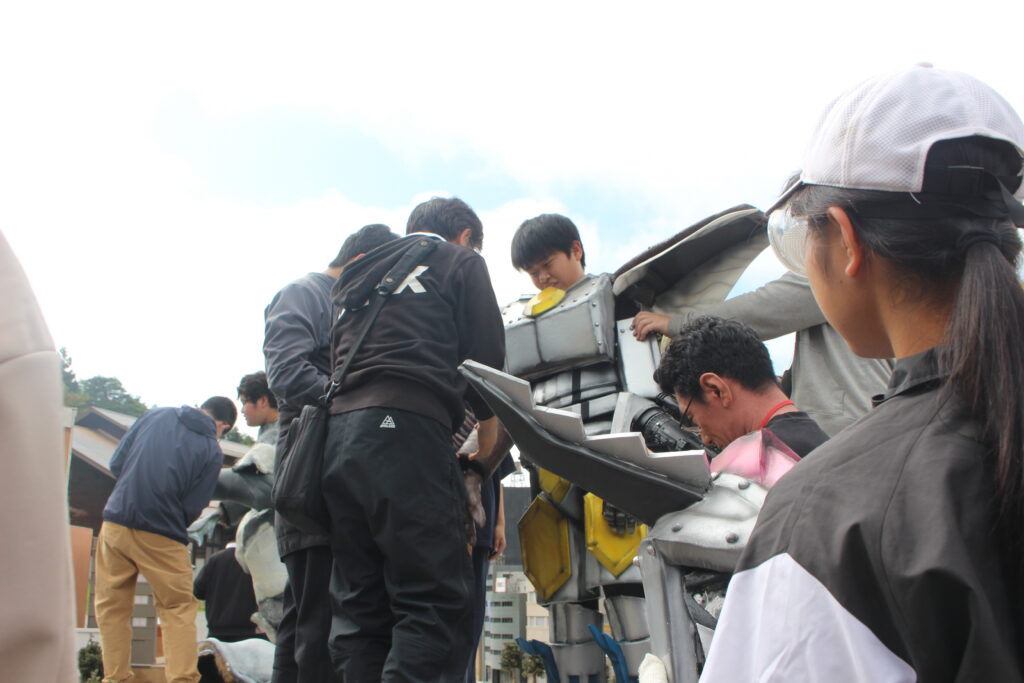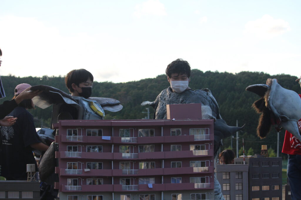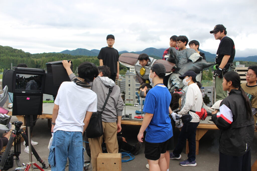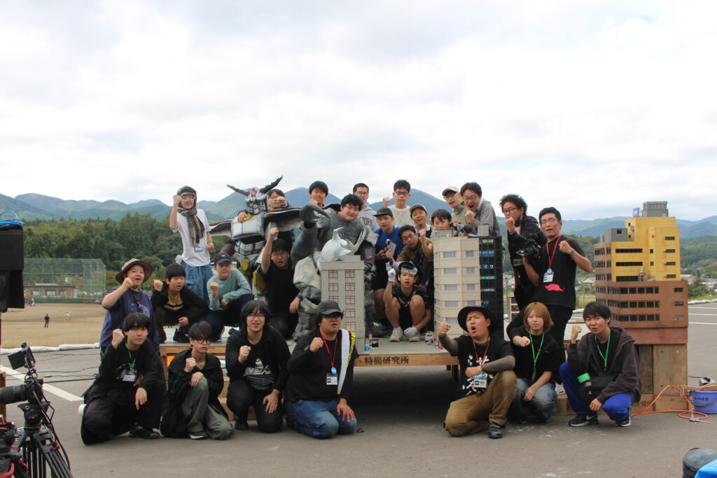 様々な映画や特撮作品の撮影で使用されている、須賀川市内施設「ながぬまラボ」で特撮撮影を行いました。10月にしては珍しく台風の影響を受けてしまい、土曜日は雨のため活動を行わず、日曜日と月曜日に活動を行いました。今年はムシ型ロボ「クワガッシャー」と兜虫怪獣「ビートラン」のバトルシーンをたっぷり撮影しました。にらみ合いや取っ組み合い、必殺技を繰り出すところまで、クワガッシャーもビートランもスーツアクターを交代しながら、たくさんのシーンを撮影しました。激しいバトルによって巻き上がる土煙やガレキなども、かっこよく表現するために塾生が複数人で協力しながら担当しました。月曜日の午後には、ながぬまラボA棟の屋内でクワガッシャーの格納庫シーンの撮影も行いました。ワクワク感のある格納庫シーンや迫力のバトルシーンを大画面で見るのが今から楽しみです。