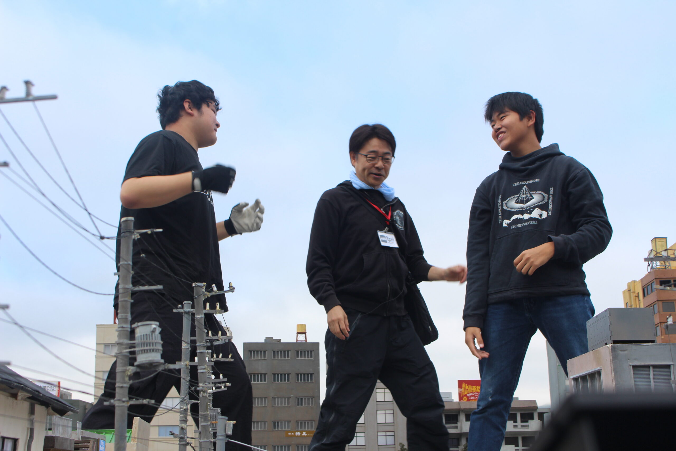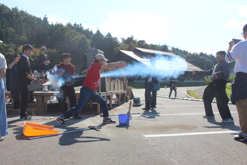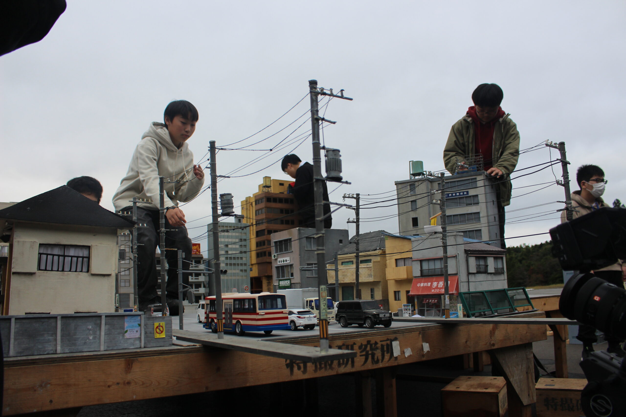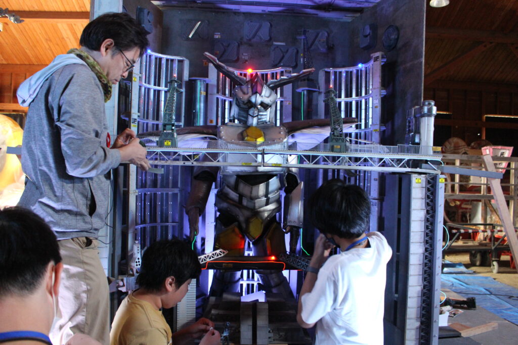 様々な映画や特撮作品の撮影で使用されている、須賀川市内施設「ながぬまラボ」で特撮撮影を行いました。10月にしては珍しく台風の影響を受けてしまい、土曜日は雨のため活動を行わず、日曜日と月曜日に活動を行いました。今年はムシ型ロボ「クワガッシャー」と兜虫怪獣「ビートラン」のバトルシーンをたっぷり撮影しました。にらみ合いや取っ組み合い、必殺技を繰り出すところまで、クワガッシャーもビートランもスーツアクターを交代しながら、たくさんのシーンを撮影しました。激しいバトルによって巻き上がる土煙やガレキなども、かっこよく表現するために塾生が複数人で協力しながら担当しました。月曜日の午後には、ながぬまラボA棟の屋内でクワガッシャーの格納庫シーンの撮影も行いました。ワクワク感のある格納庫シーンや迫力のバトルシーンを大画面で見るのが今から楽しみです。