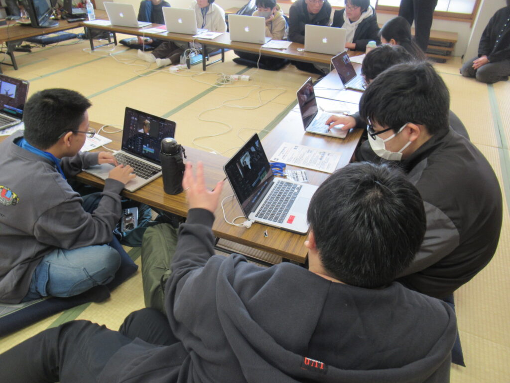 編集作業では、編集ソフトの基本操作から学び、映像をつなげたり、効果音をつけたりするところまで作業しました。2日間の最後にはそれぞれが編集した映像を発表しあい、同じ素材を使っても異なる映像が出来上がることが体験できました。